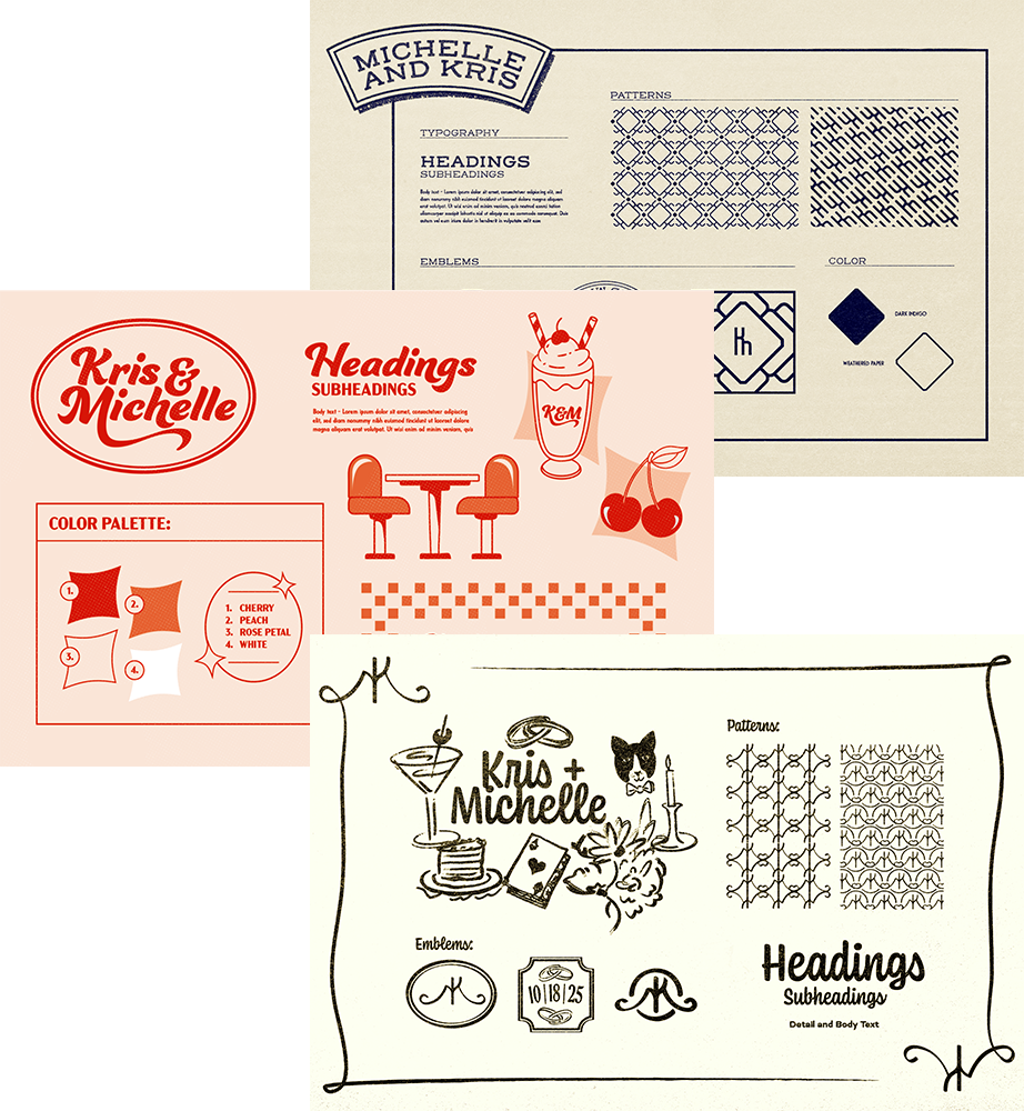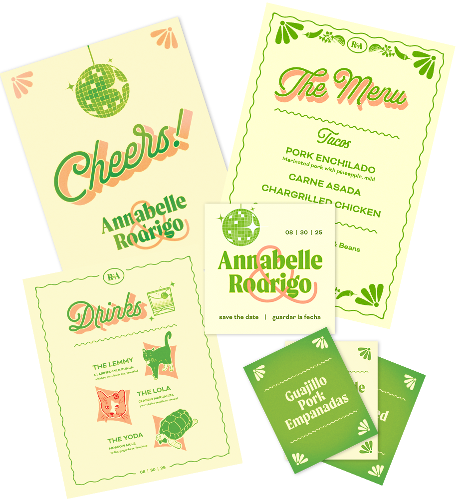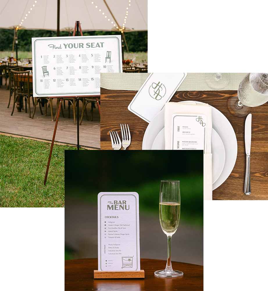 Next StepOnce your style guide is approved by you, we'll design everything you need from it – invites, menus, seating charts, table numbers, and beyond. Every piece will feel like it belongs together, because it does.